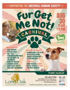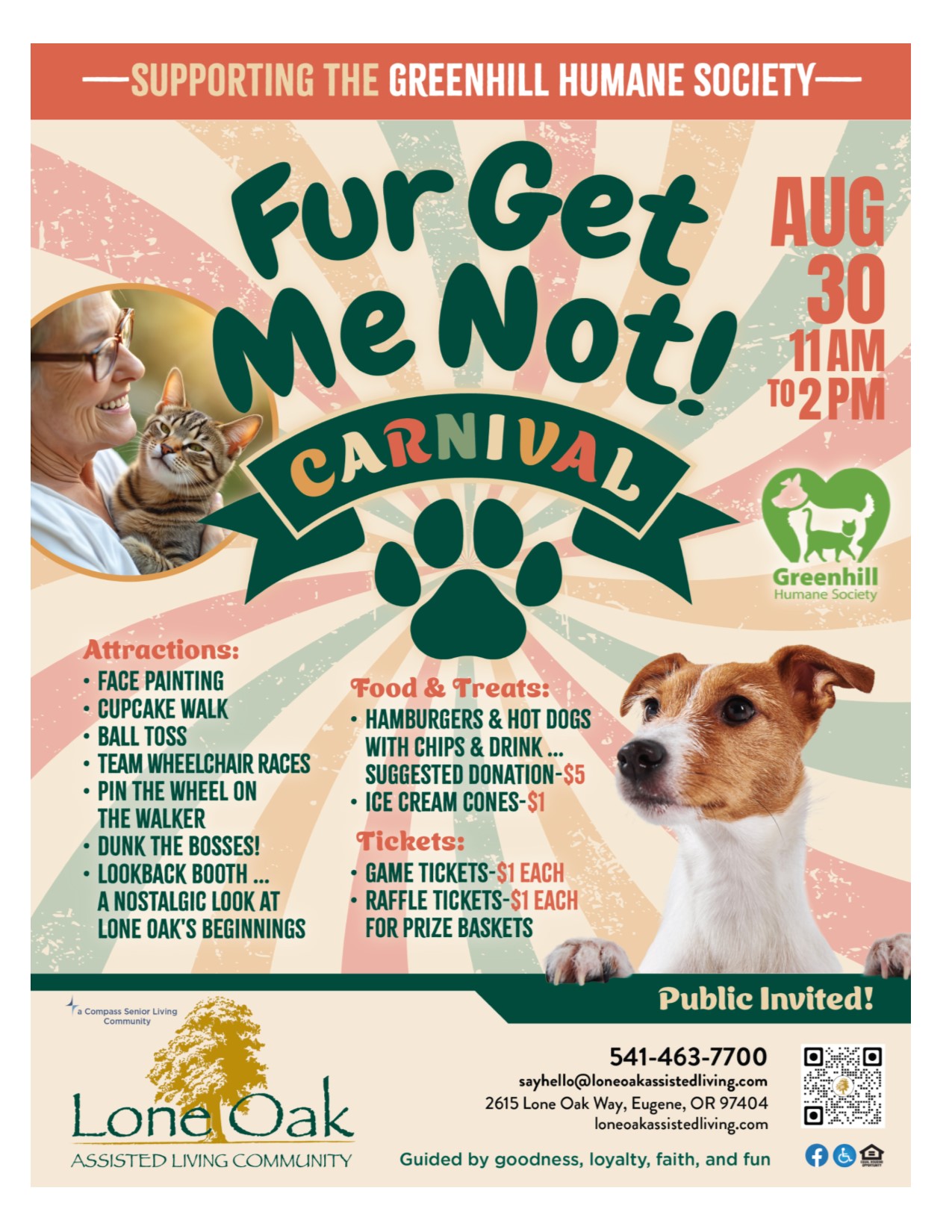 Join us on 8/30 from 11am-2pm for the Fur Get Me Not Carnival with Lone Oak Assisted Living Community to support Greenhill Humane Society! All proceeds benefit Greenhill Humane Society- games, raffle tickets, food, beverages, and many more fun attractions including: cupcake walk, face painting, pin the wheel on the walker! Game tickets are $1 each!  Greenhill will be at Lone Oak Assisted Living from 11am-1pm with an adoptable dog, and with an Outreach table from 11am-2pm. Come have some fun at Lone Oak Assisted Living Community.