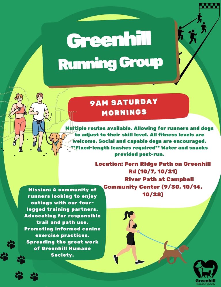 Mission: A community of runners looking to enjoy outings with our four-legged training partners. Advocating for responsible trail and path use. Promoting informed canine exercise practices. Spreading the great work of Greenhill Humane Society.