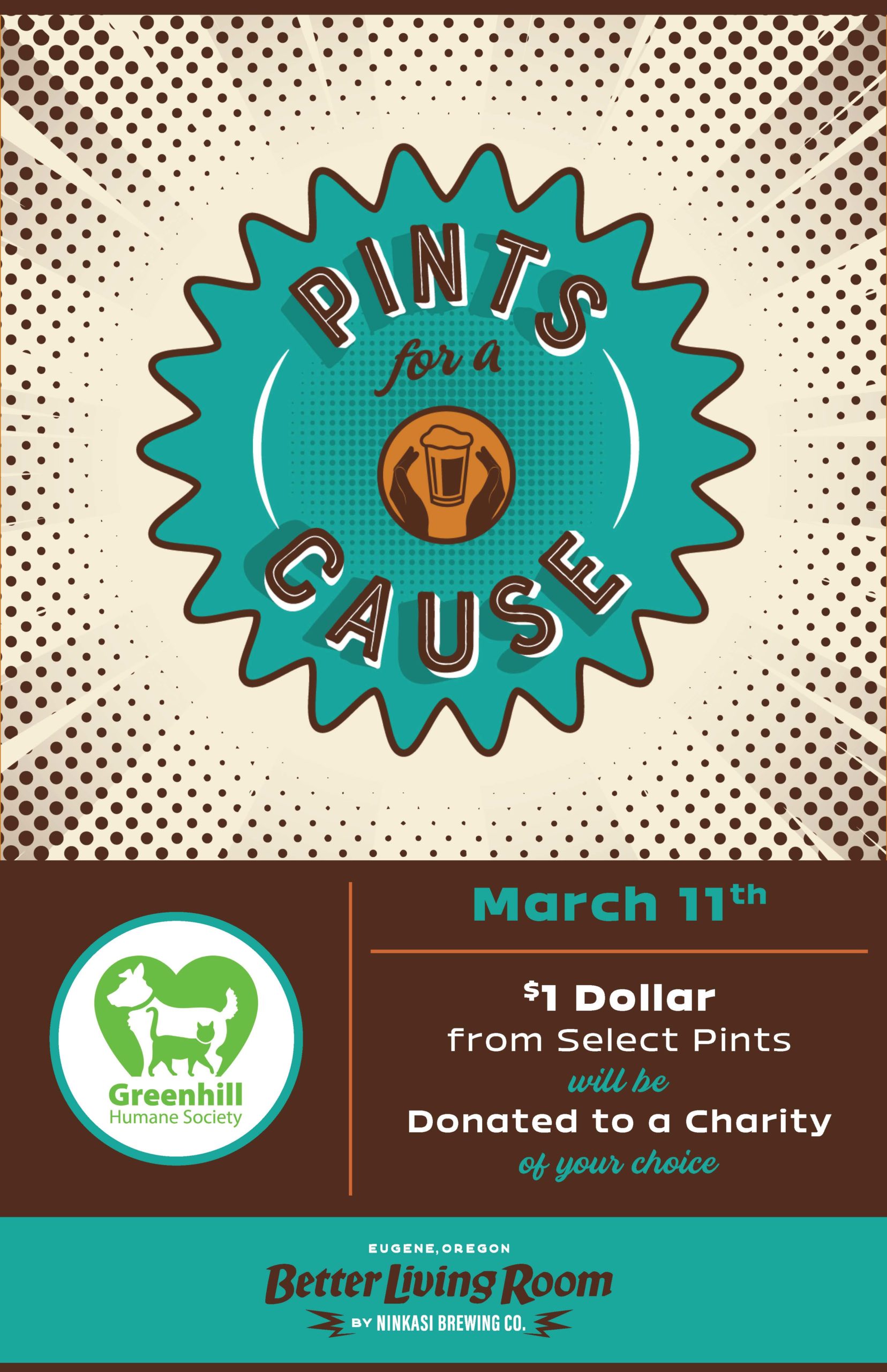 Join Greenhill Humane Society at The Ninkasi Better Living Room on Friday, March 11th for Pints for a Cause! Dogs are welcome at the outdoor patio!
