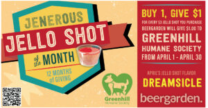 All month long: For every $3 Jello shot you purchase, beergarden will give $1 to Greenhill – this April 1st – 30th!