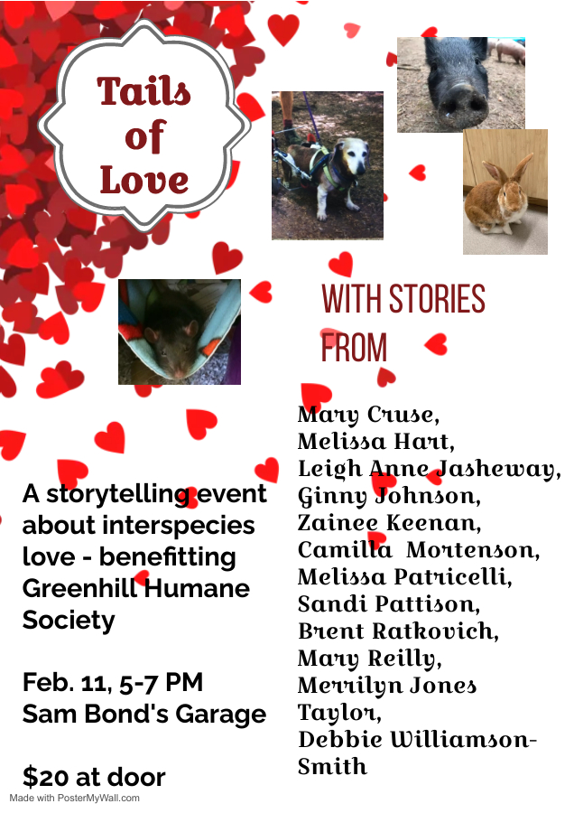 You are welcome to join the Tails of Love on February 11th from 5-7 pm at Sam Bonds Garage. Storytellers will share funny, heartwarming, and inspiring stories about the love we give and receive from our animal companions.