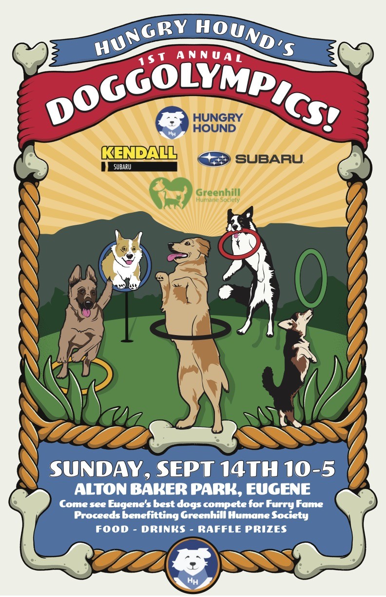 Join Us on 9/14/25 at Hungry Hound's 1st Annual Doggolympics at Alton Baker Park from 10am-5pm with proceeds benefitting Greenhill Humane Society- this event is free to the public to attend, and features a dog ability competition for your pup to