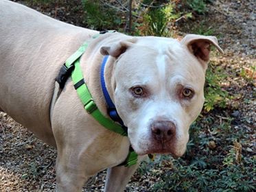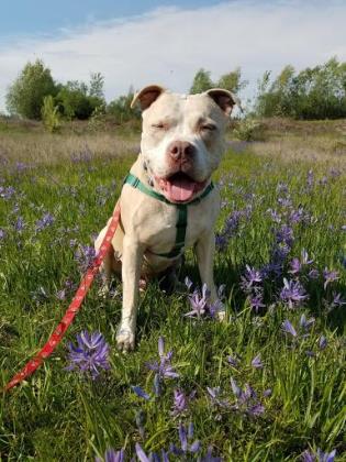 But, in 2017, it was a community effort to try and find a home for this 10-year-old, 76 pound, tan and white pit mix with the massive head! The real story is what happened before and after that.