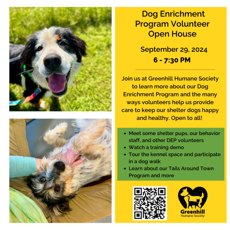 “We’ve seen an increase in dogs coming to the shelter this year and are in need of more animal lovers to join our volunteer team,” said Sarah Bouzad, Greenhill’s Community Engagement & Events Manager. “Maybe you love dogs but are unable to add one to your family at the moment, or you are looking for a rewarding experience to help vulnerable animals. This open house is a great event to learn more about what it is like to become a dog enrichment volunteer. Greenhill provides all the training and materials needed for volunteers, plus there is an endless supply of cute dogs!”