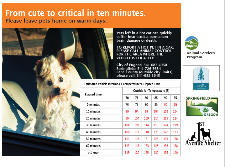 • Remember that leaving your animal in a hot, parked car for just a few minutes can cause heat stroke, brain damage, or worse.