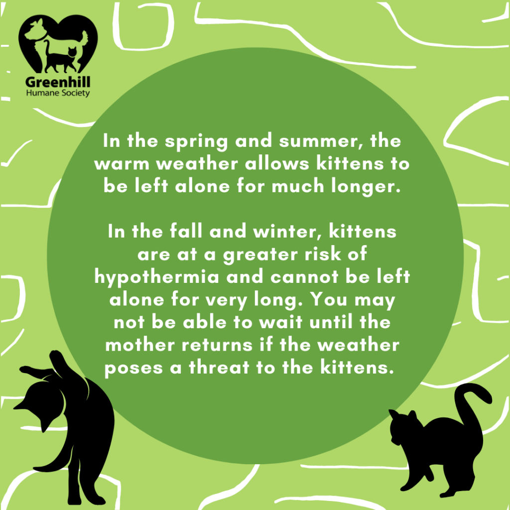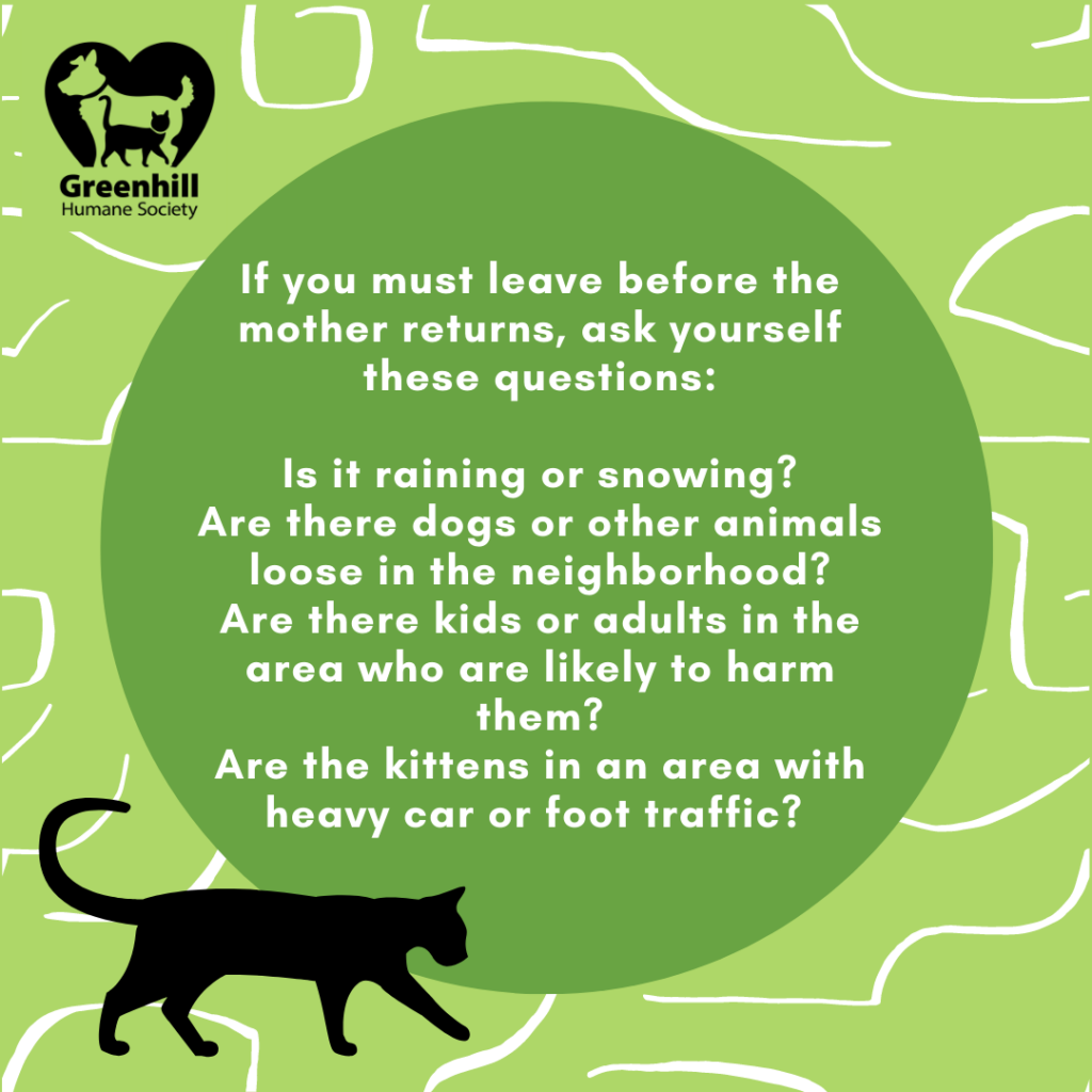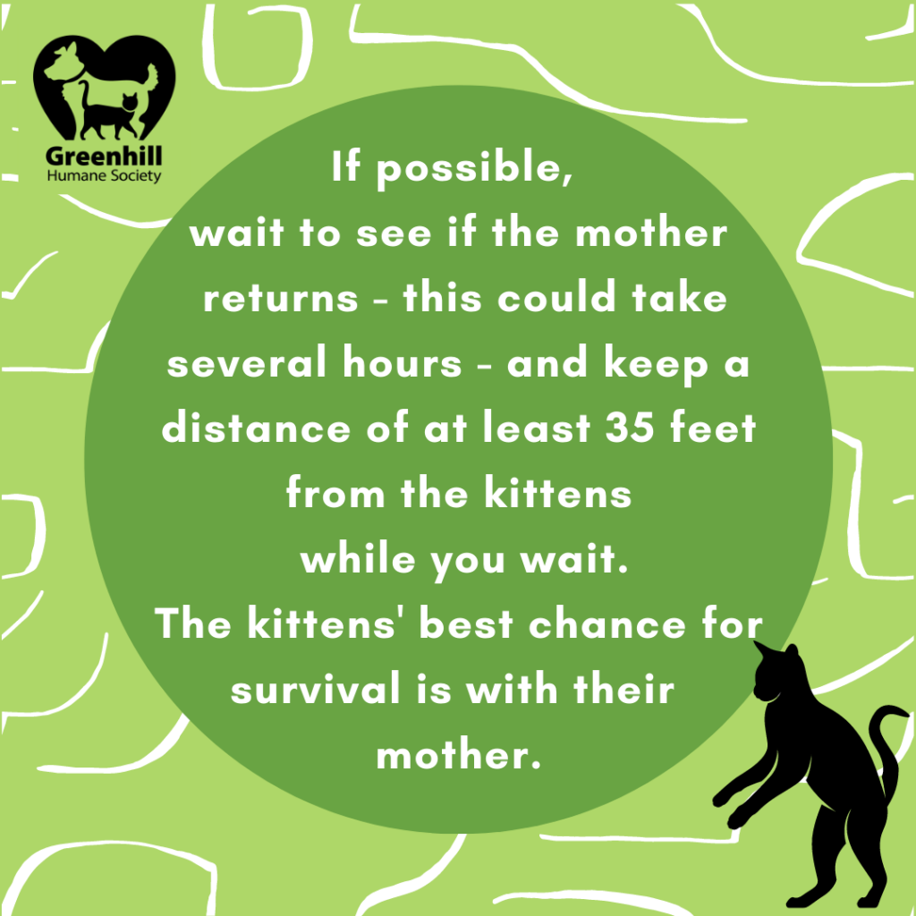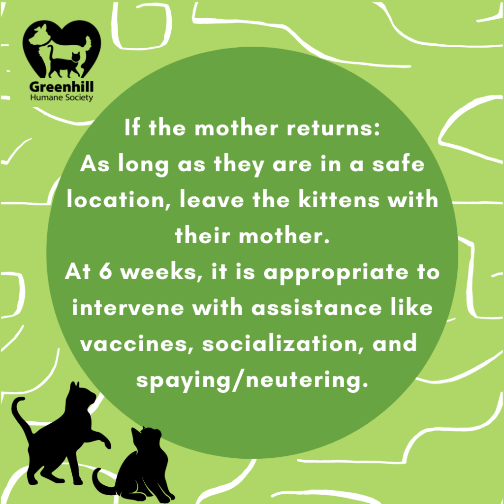 If you discover that the mom has been hit by a car or if for any reason it appears that she is not coming back, then please call Greenhill at 541.689.1503 for further guidance before picking up the kittens.